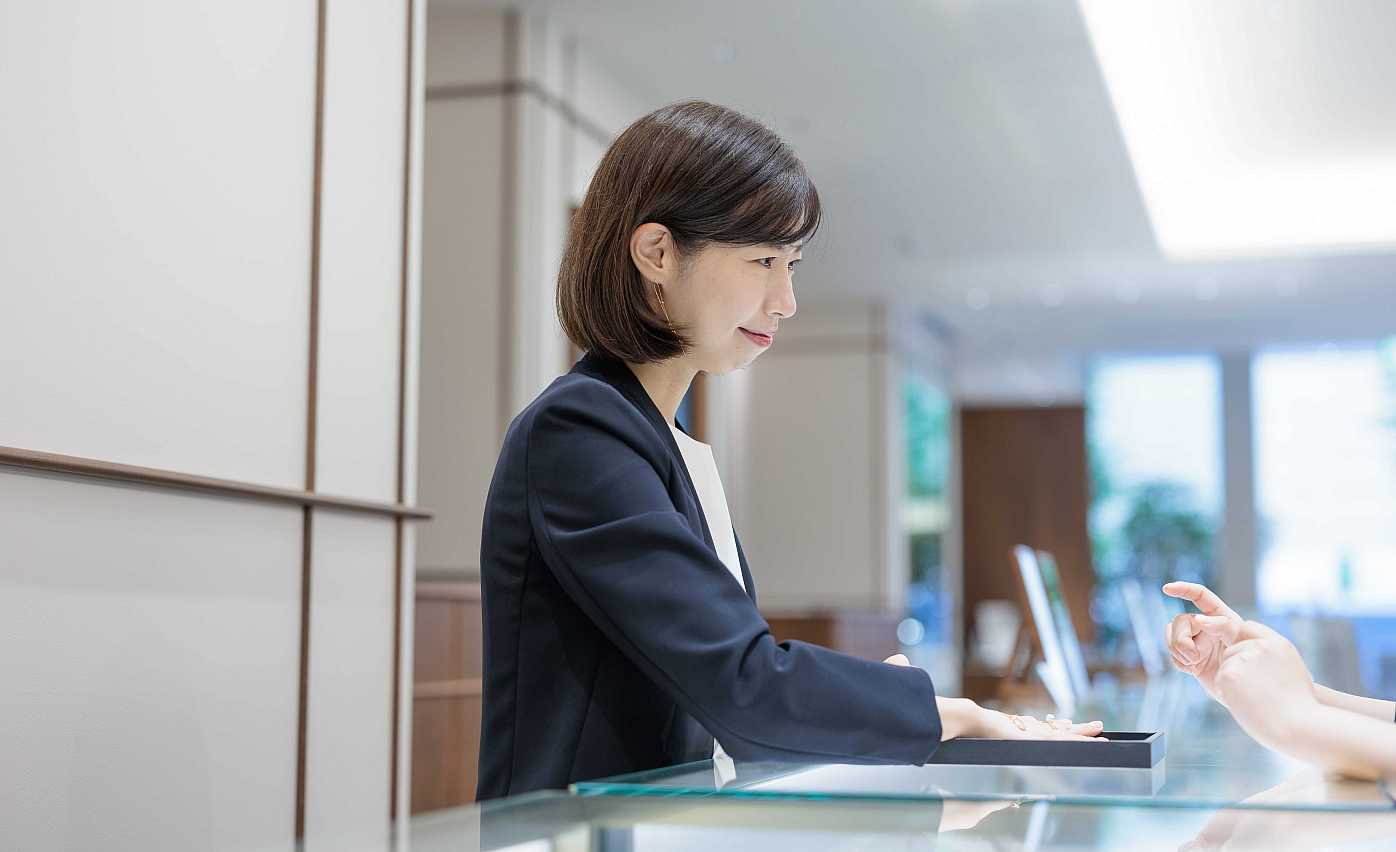当社が提供しているのはお客様の人生に寄り添うジュエリー。例えば、一生身に着けるブライダルジュエリー(結婚、婚約指輪)をご提案することも。そこに必要なのはお客様を想うホスピタリティです。接客・販売の枠にとらわれず、人の喜ぶ顔をつくり出したい方にピッタリのお仕事。