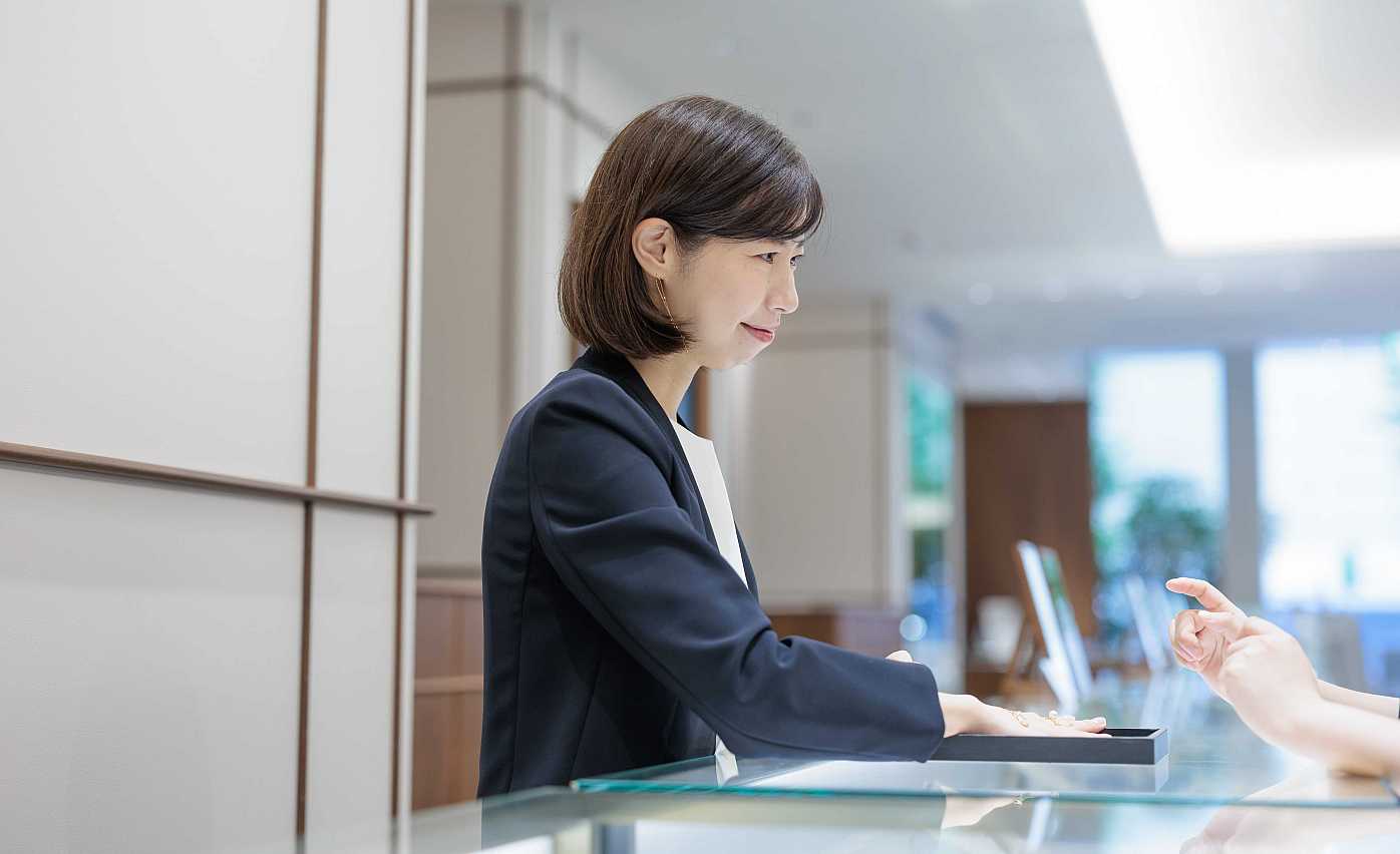 販売未経験でも「お客様に満足していただきたい」という想いがあれば大丈夫。ジュエリーの商品知識はもちろん、言葉遣いや接客マナーもイチから学べ、現場では、先輩社員がマンツーマンであなたをサポートします!